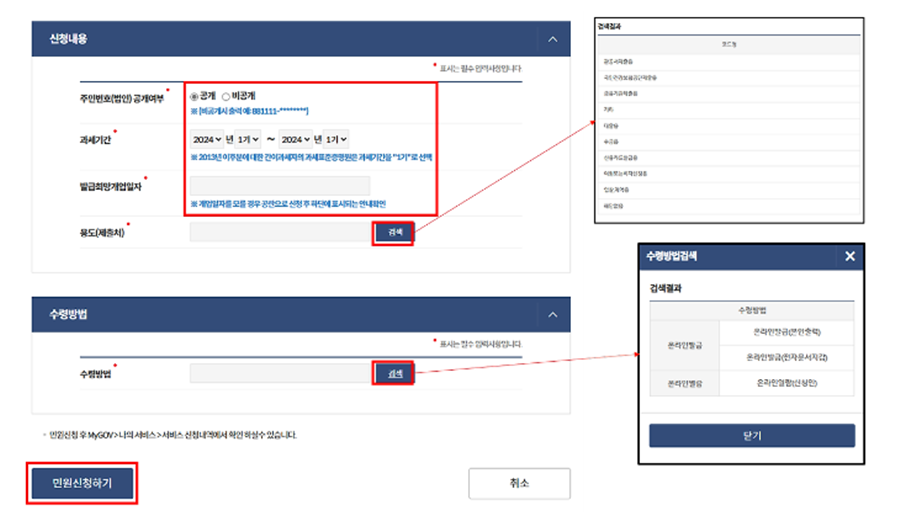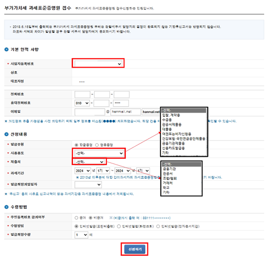 2) 사업자등록번호 입력 ▶ 발급정보 입력 ▶ 용도 (제출처), 수령방법 선택 ▶ 민원신청하기