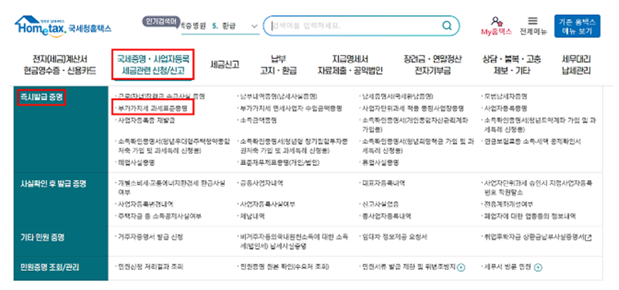 국세증명 사업자등록 세금관련 신청신고 ▶ 즉시발급 증명 ▶ 부가가치세 과세표준증명