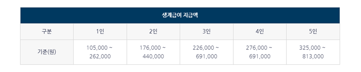 - 생계급여 (가구규모별 소득구간별 차등지급)