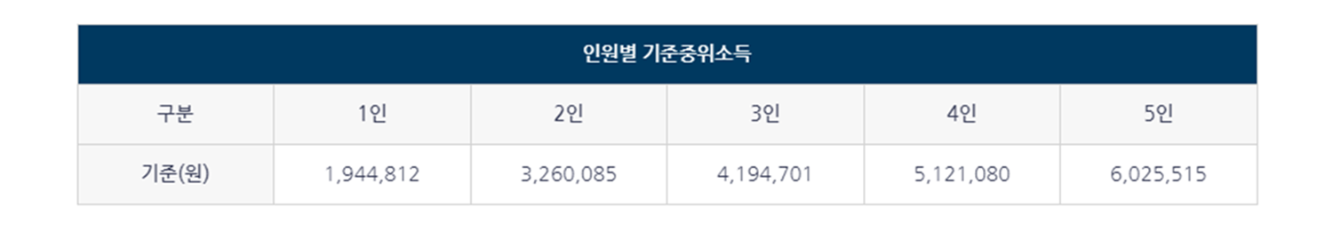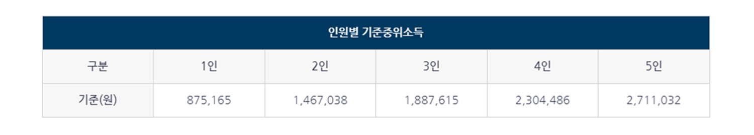 - 기준 중위소득 45% 이하인 가구 (1인가구 기준 월 87만원 이하)