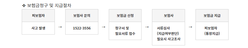 보험금 청구 사유가 발생 할 경우 피해자 또는 법정상속인이 보험사에 문의후 보험청구서와 필요서류를 준비합니다. 필요서류는 보험사 홈페이지에서 내려받으실 수 있습니다.