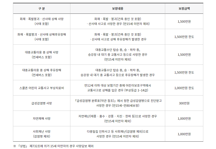 1. 화재·폭발·붕괴(건축 중인 것 포함) · (사태포함) 산사태 사고로 상해 사망한 경우 (15세 미만자 제외)