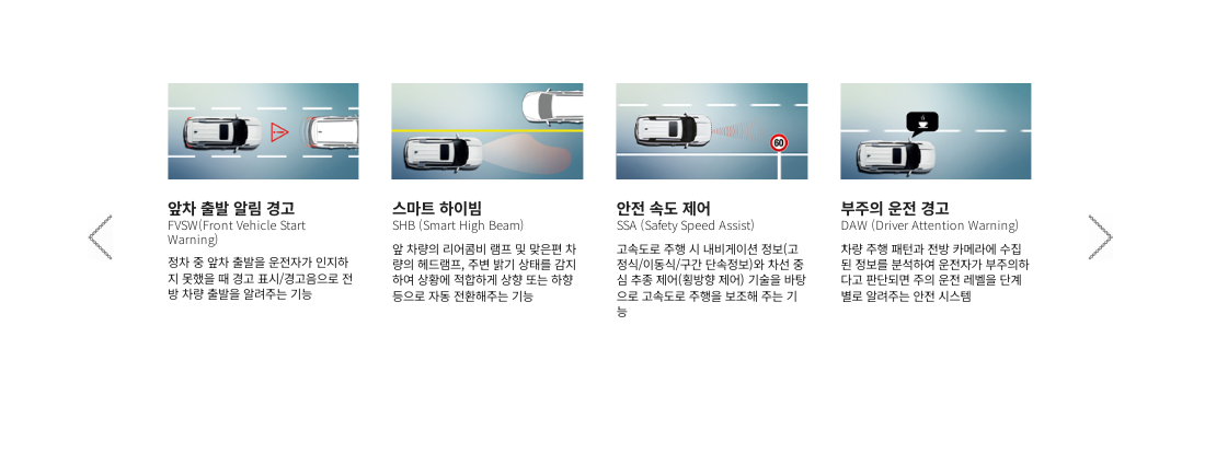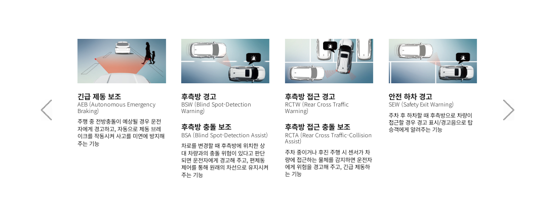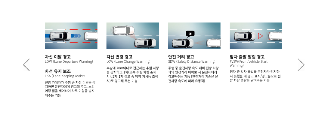 긴급제동 보조, 후측방 경고, 후측방 충돌 보조, 후측방 접근 경고, 후측방 접근충돌 보조, 안전하차 경고, 차선이탈 경고, 차선유지 보조, 차선변경 경고, 안전거리 경고,