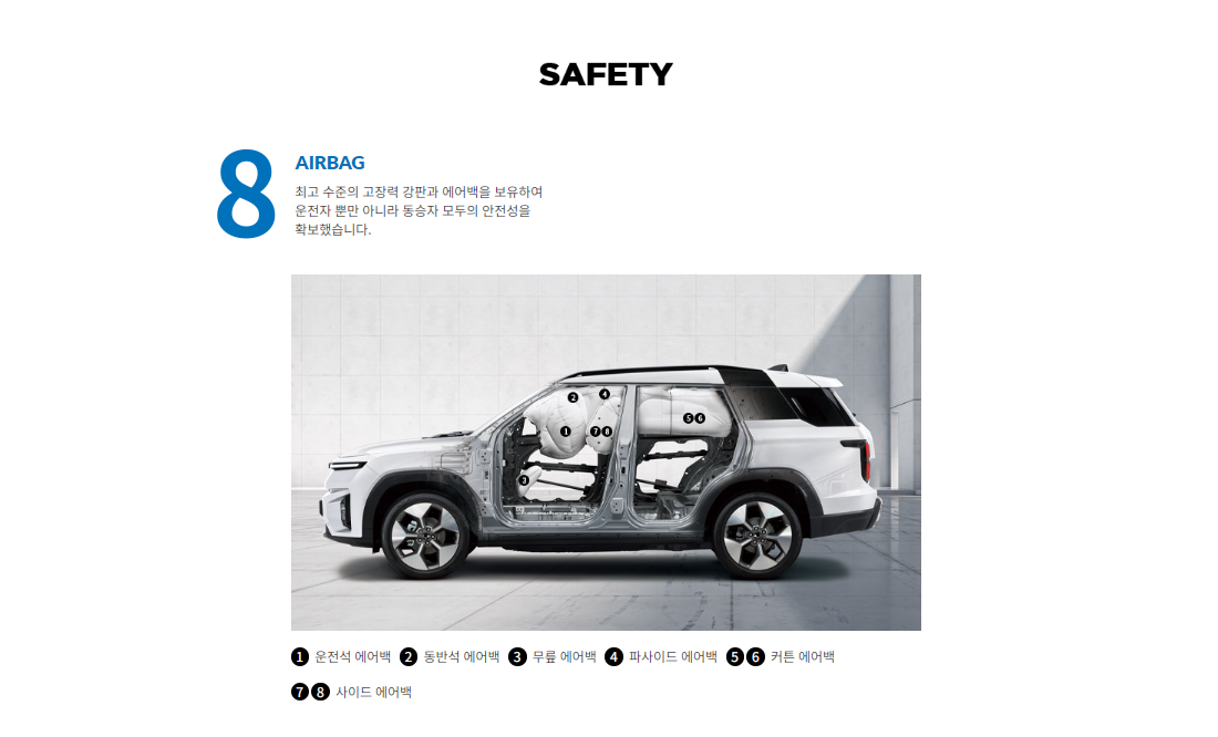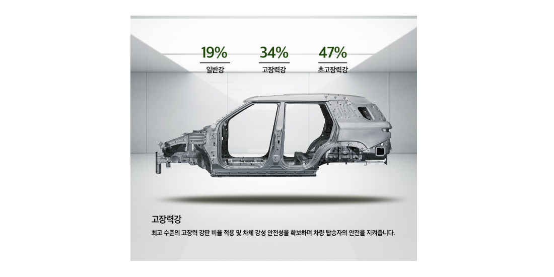 최고 수준의 고장력 강판 비율 적용 및 차체 강성 안전성을 확보하여 탑승자의 안전에 만전을 기했다고 합니다.