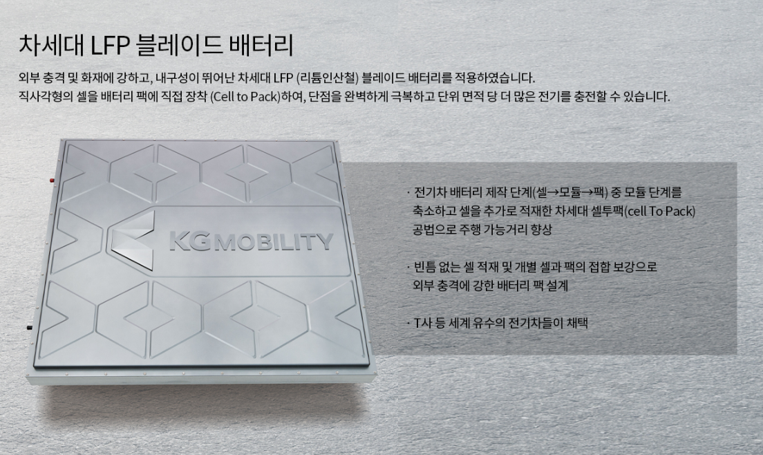 LFP (리튬인산철) 배터리는 외부충격 및 화재에 강하고, 내구성이 뛰어나도록 설계되었으며, 직사각형의 셀을 배터리 팩에 직접 장착 (Cell to Pack) 하여, 단점을 완벽하게 극복하고 단위 면적 당 더 많은 전기를 충전할 수 있다고 합니다.